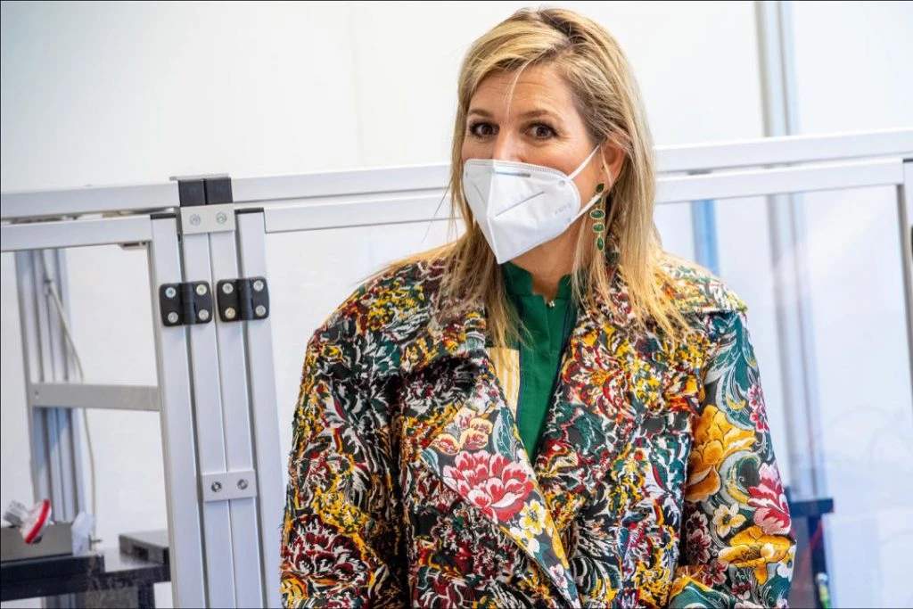 En el contexto de la lucha contra el coronavirus, la Reina de los Países Bajos visitó un centro que trabaja en la fabricación de respiradores. Usó barbijo y no renunció a su tradicional energía y glamour para vestirse.