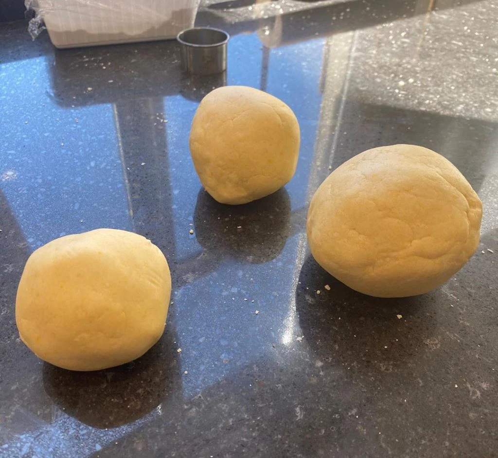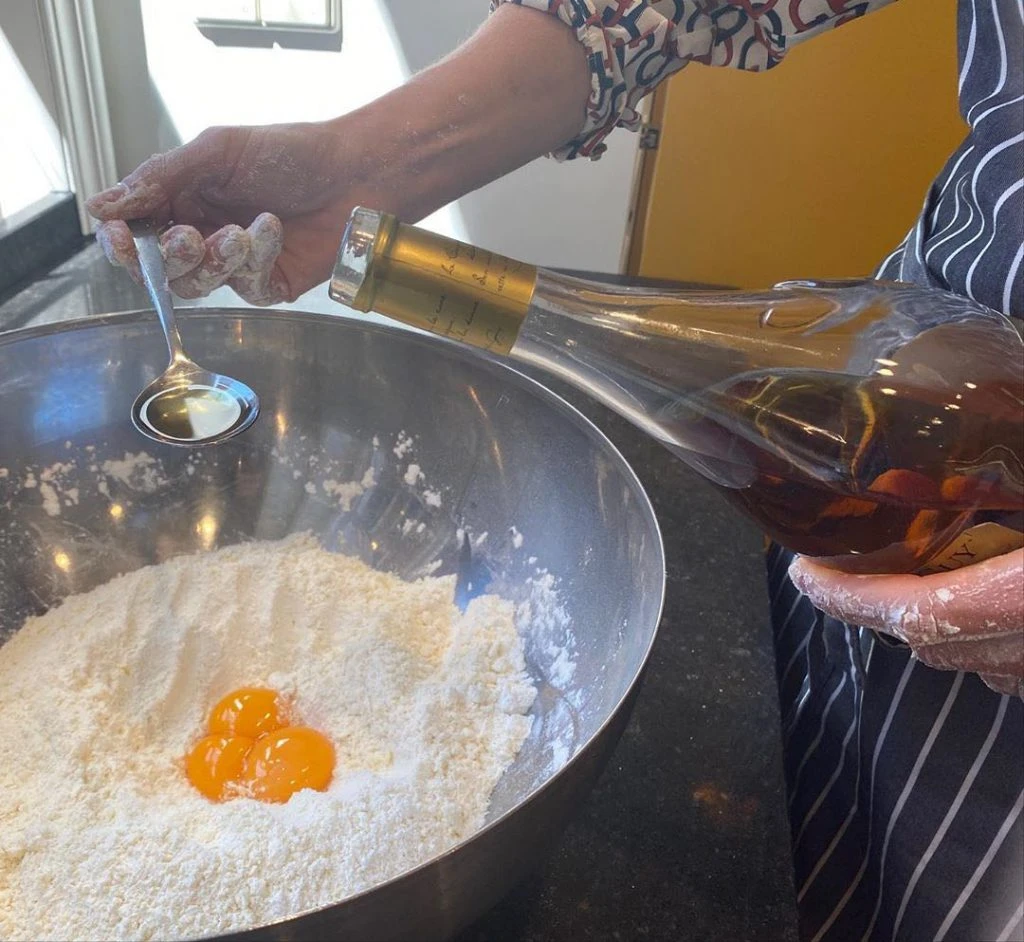 - Paso 3: Agregá las yemas de huevo y el cogñac. Amasá a mano en una masa firme.