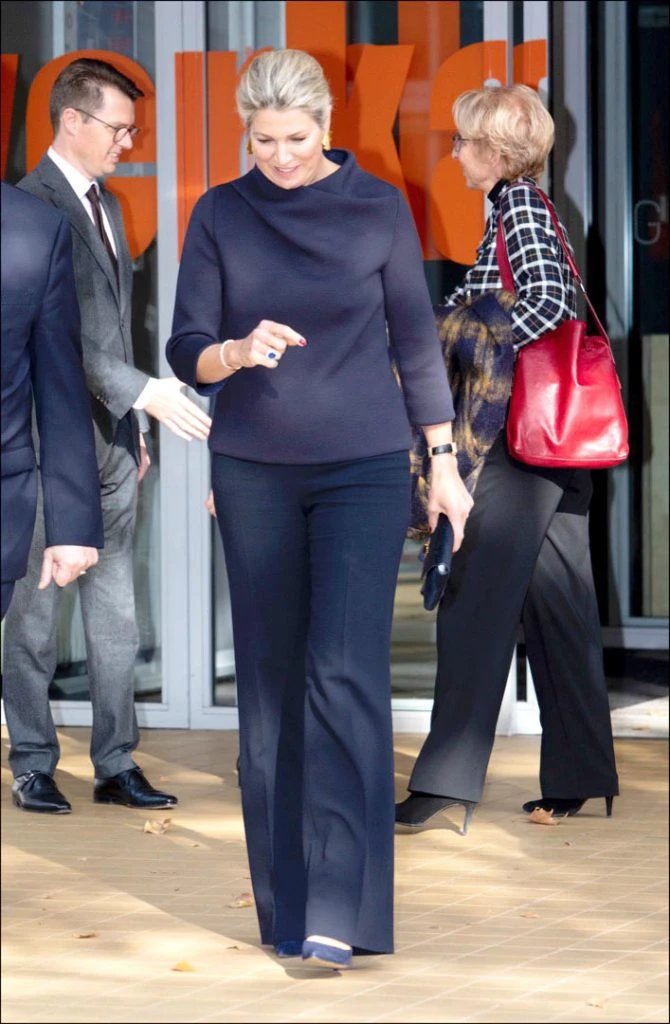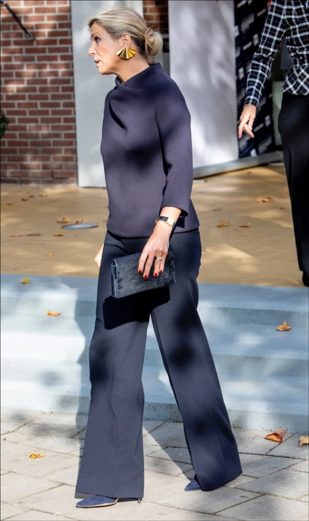 La reina de Holanda se lookeó con un suéter de jersey real de cuello alto y volcado hacia un costado y un pantalón ancho a tono.