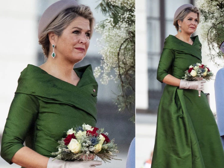 Al bajarse del auto, la reina de Holanda acaparó todas las miradas. Con un estilismo sofisticado y súper elegante, adoptó un vestido de taftán en color verde, uno de sus tonos favoritos.