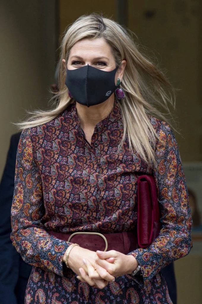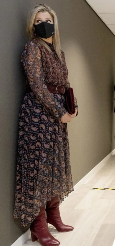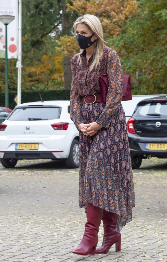Para esta visita, Máxima eligió un look súper cool. Llevó un vestido tipo camisero de gasa estampada con arabescos. El vestido es largo midi asimétrico y ella le sumó un cinturón de cuero en color bordó que combinó con botas altas de taco y sobre de mano.