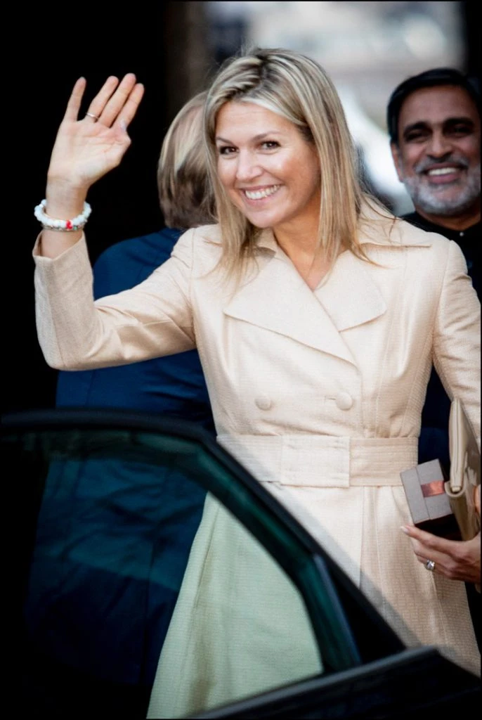 El trench beige es el nuevo básico. El ítem de moda que ahora se lleva con o sin lluvia. Y Máxima que siempre sigue las tendencias, eligió un vestido tipo trench para asistir a un seminario en Amsterdam, acompañada por su marido, el Rey de Holanda, que trataba asuntos como las relaciones entre la India y Holanda.