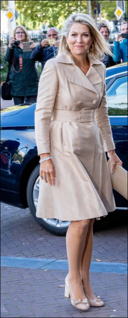Máxima llevó un total look en color beige. Eligió un vestido estilo gabardina de lino y unos zapatos en el mismo color del vestido y un lazo. El diseño llevaba doble abotonadura, solapas y cinturón que marcaba la silueta. Un look monocolor muy acertado con un diseño que Máxima usó en varias oportunidades (la primera vez fue en 2009).