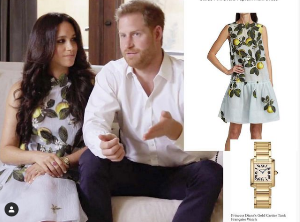 Meghan también sorprendió con su estilo de cabello largo y suelto, con ondas. Y acompañó el look con un reloj Cartier de oro que perteneció a Lady Di.
