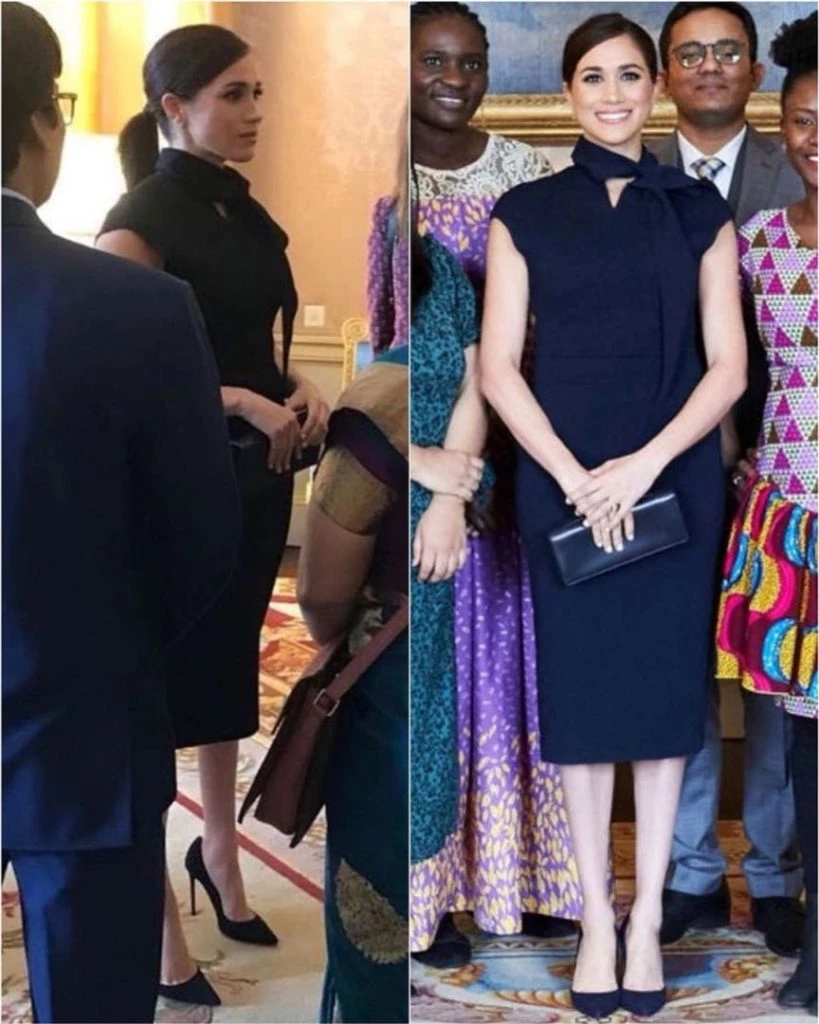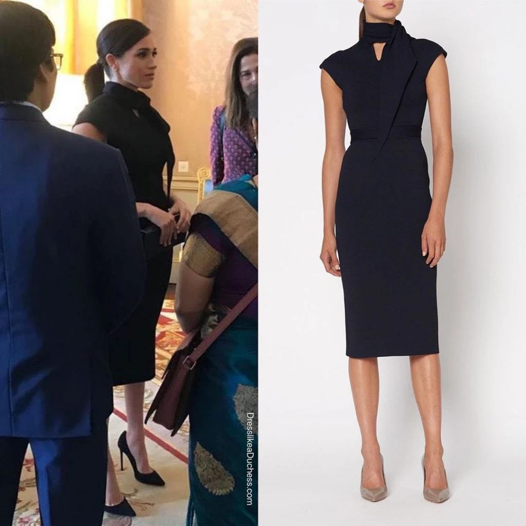 Meghan llevó un vestido azul marino de crepé, ajustado, con corbata y pequeño escote en V del diseñador australiano Scanlan Theodore. Y combinó el look con los stilettos de Aquazzura que suele usar. Según la marca, "la corbata ofrece un poco de coqueteo femenino".