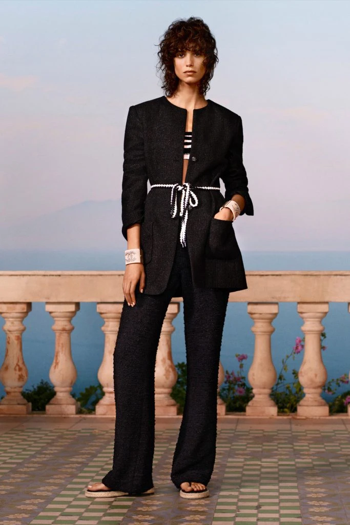 El icónico tweed convive en con polleras de rayas asimétricas, jeans acampanados, pantalones Capri y camisas de gasa.