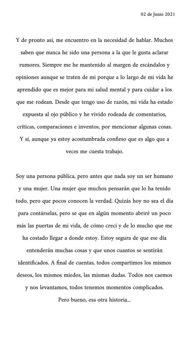 Luego se refirió a cómo estas circunstancias la afectaron humanamente: “Soy una persona pública, pero antes que nada soy un ser humano y una mujer. Una mujer que muchos pensarán que lo ha tenido todo, pero que pocos conocen de verdad. Quizás hoy no sea el día para contárselas, pero se que en algún momento abriré un poco más las puertas de mi vida, de cómo crecí y de lo mucho que me ha costado llegar a donde estoy" y luego manifestó empatía con las personas que, como ella, se ven obligadas a enfrentar este tipo de situaciones: " Estoy segura que es día entenderán muchas cosas y que unos cuantos se sentirán identificados. A final de cuentas, todos compartimos los mismos deseos, los mismos miedos, las mismas dudas. Todos nos caemos y nos levantamos, todos tenemos momentos complicados. Pero bueno, esa es otra historia…” amplió.