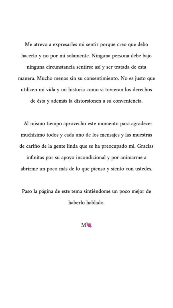 “Me atrevo a expresarles mi sentir porque creo que debo hacerlo y no por mí solamente. Ninguna persona debe bajo ninguna circunstancia sentirse así y ser tratada de esta manera. Mucho menos sin su consentimiento. No es justo que utilicen mi vida y mi historia como si tuvieran los derechos de ésta y además la distorsionen a su conveniencia. Al mismo tiempo aprovecho este momento para agradecer muchísimo a todos y cada uno de los mensajes y las muestras de cariño de la gente linda que se ha preocupado por mí. Gracias infinitas por su apoyo incondicional y por animarme a abrirme un poco más de lo que pienso y siento con ustedes. Paso la página de este tema sintiéndome un poco mejor de haberlo hablado” finalizó la primogénita de Luis Miguel.