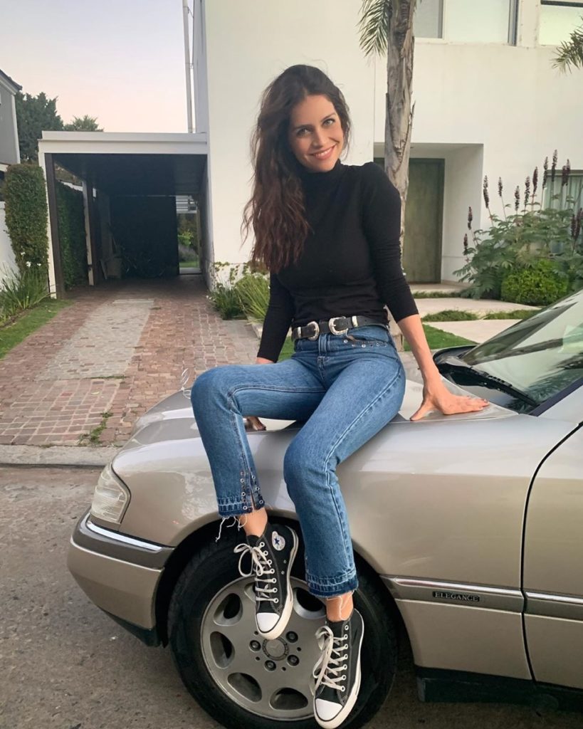 Sentadas en el capot de un auto, su outfit es casi el mismo: polera negra, jeans celestes de tito alto, cinturón con hebilla plateada y zapatillas negras.