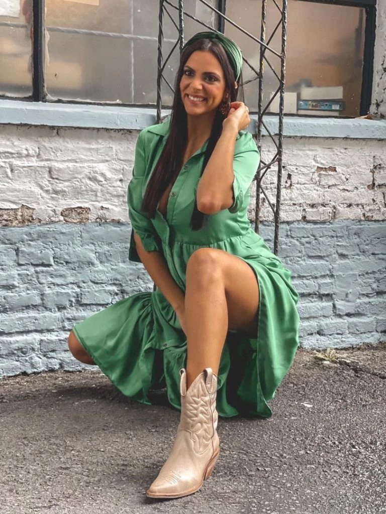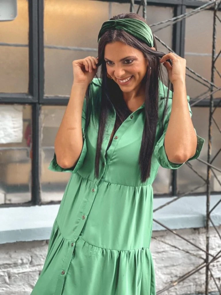 Con un lindísimo vestido camisero en verde esperanza, botas texanas cortas en color nude y vincha la influencer mostró su nuevo look, en televisión, por primera vez.