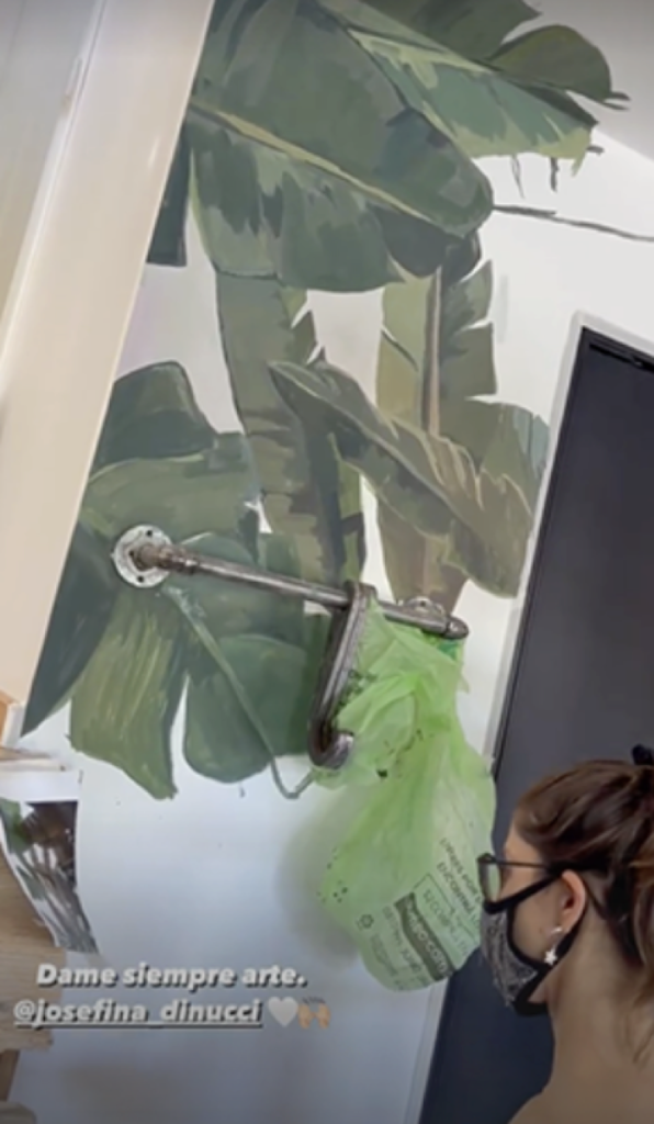 Gimena compartió a través de sus historias de Instagram cómo fue el paso a paso de este espectacular mural lleno de hojas verdes con un estilo muy selvático y tropical.