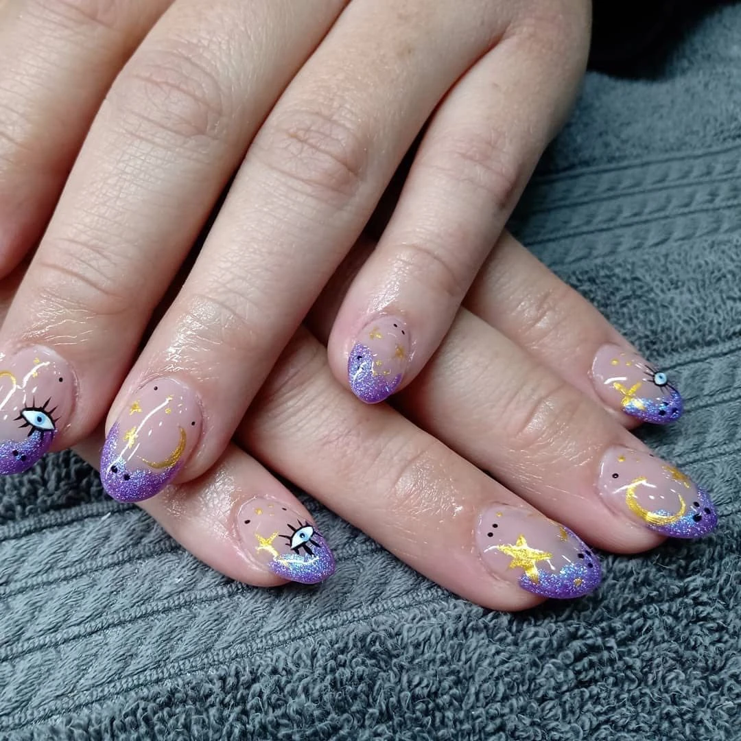 En esta otra opción, vemos que se mantiene el fondo transparente, con diseños realizados con esmaltes metalizados en dorado y violeta, con ilustraciones en negro y celeste.