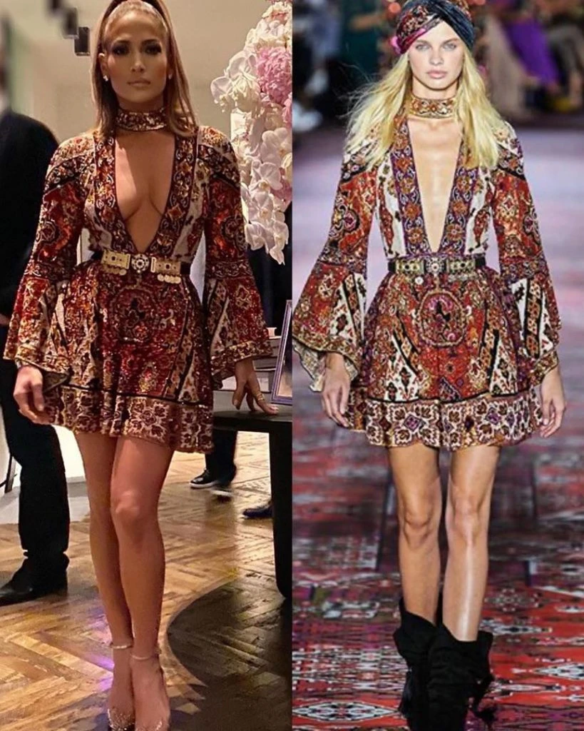 Las dos artistas usaron un mini vestido, con estampa tipo arabesco, gran escote (aunque diferente porque el de JLo era profundo hasta la cintura) y los usaron con cinturón para que les marcara la cintura.