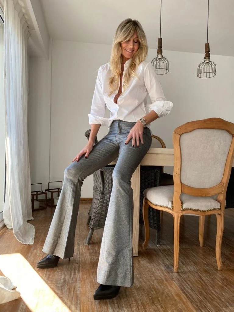 A este pantalón, Sole le sumó una camisa blanca básica y un par de botas con taco aguja. El pantalón y la camisa son de De la Ostia y le sumó al look una pulsera de UNOde50.