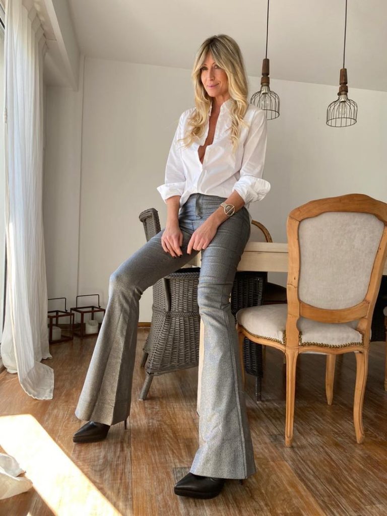 A este pantalón, Sole le sumó una camisa blanca básica y un par de botas con taco aguja. El pantalón y la camisa son de De la Ostia y le sumó al look una pulsera de UNOde50.