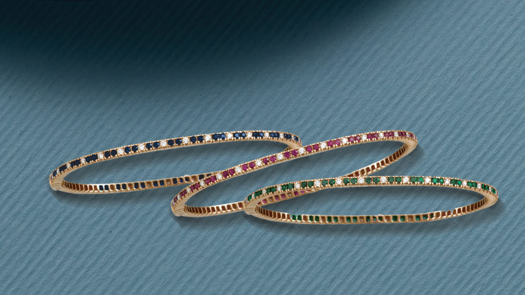 De izquierda a derecha: pulsera esclava de oro rosa con brillantes y zafiros, rubíes y esmeraldas.