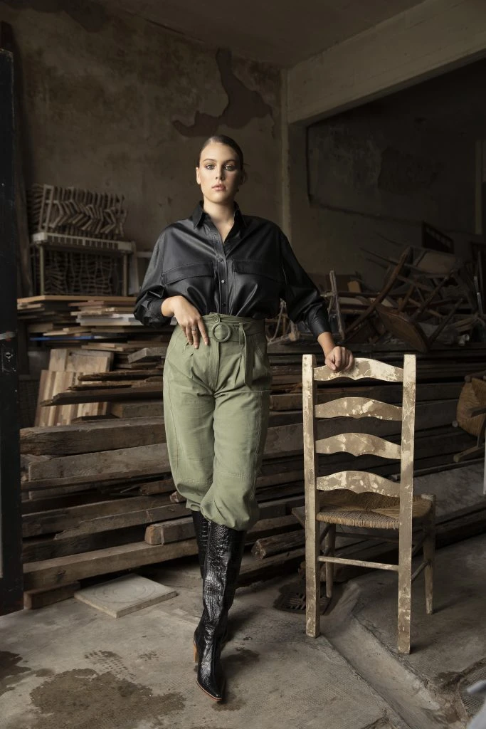 pantalón de eco cuero ($ 6.990, MNG para Falabella).