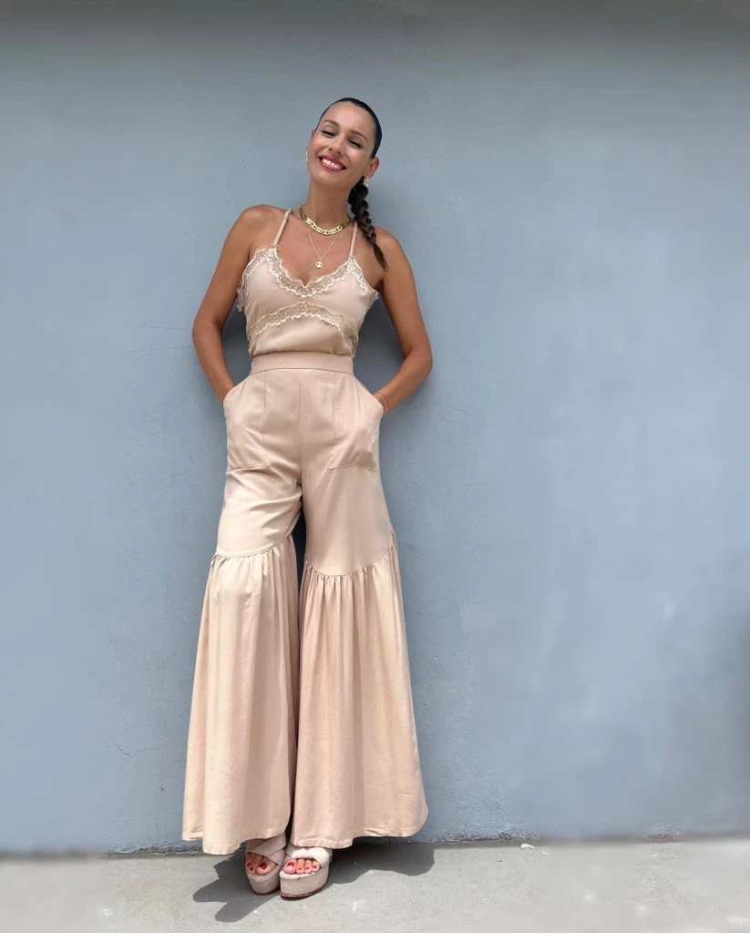 El otro look monocolor que lució Pampita es en nude, con un top lencero y un pantalón de tiro alto, con la cintura marcada.