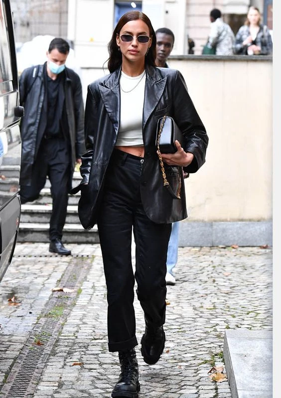 Otra tendencia que podemos utilizar durante los días de lluvia es el saco/blazer de efecto piel. En general, todas las prendas con este tejido –o similares– se convertirán en un imprescindible de la temporada: pantalones, camisas, vestidos, abrigos… Los días de lluvia en los que tengamos que ir a la oficina podemos recurrir a él, ya sea negro o marrón, con jeans o pantalones sastreros y obtendrás un look súper chic.