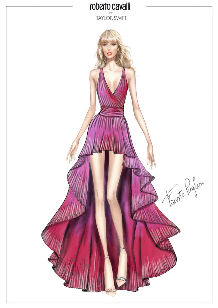 La colección del Atelier Roberto Cavalli presenta diferentes vestidos, que están inspirados en las épocas musicales de Taylor Swift. Además, requirieron más de 300 horas de un meticuloso trabajo por parte de talentosos artesanos, ya que presentan adornos con preciosos bordados de cristal.