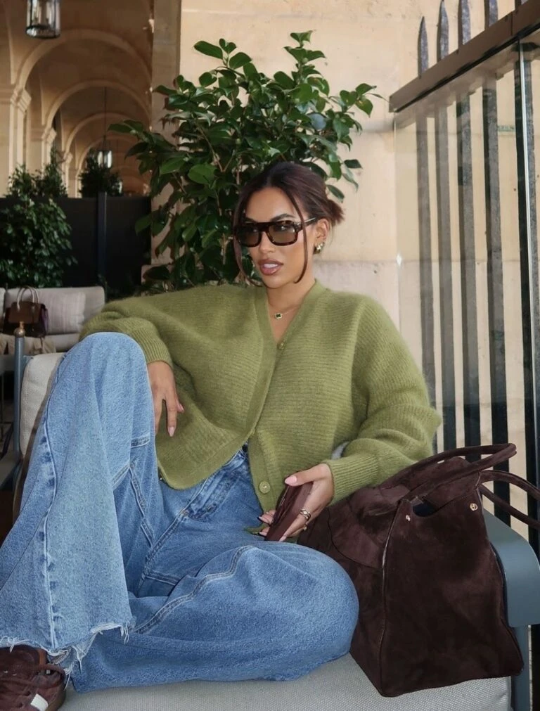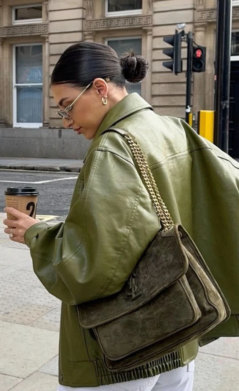 Posible de combinar con distintos tonos de denim, blanco e incluso beige, el verde oliva juega con la versatilidad y un neutro alternativo que brinda cierta audacia al outfit. Se puede utilizar a través de prendas como pantalones, sacos y sweaters complementándolo con accesorios dorados.