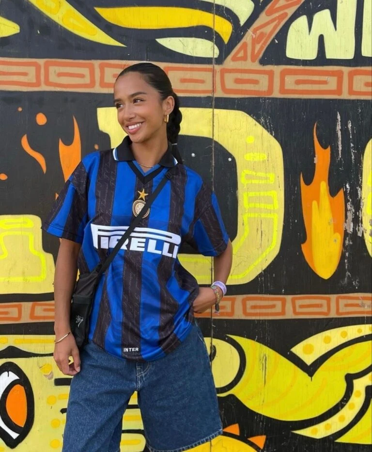 Acompañado de un jean baggy o bermuda, podés lucir la camiseta sin temor a que no combine. Resaltar los tonos de la prenda con colores fríos y oscuros en la parte de los pantalones genera una combinación armónica en contrastes de colores.