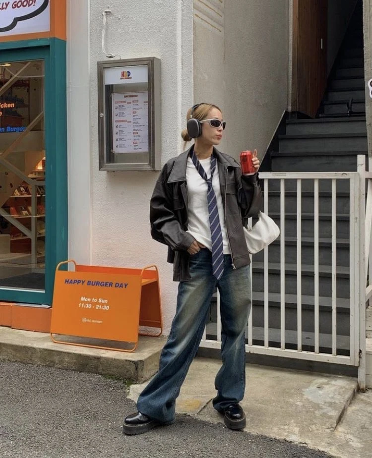 También podrías sumar un saco de cuero o una campera de jean, para aportar un nuevo tono y textura al outfit. Procurando que la atención esté en la parte superior, sería esencial optar por un pantalón de jean oscuro, ya sea negro, gris o azul.