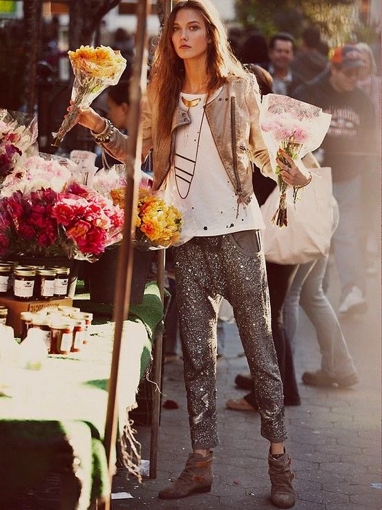 Los brillos van a estar también muy presentes en pantalones y jeans, y miren lo cancheros que quedan. Lo combina con básica blanca, campera de cuero y botas. El boho moderno se aplica de muchas formas. Solo hay que elegir la que más vaya con nuestro estilo.