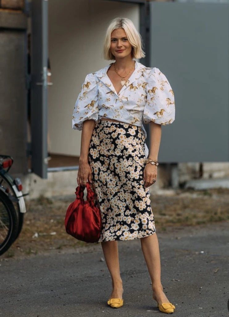 Este atuendo puede ser tranquilamente para ir a la oficina y es muy interesante ver cómo combina los estampados, jugando a pesar de las diferencias, pero priorizando los mismos tonos. En la camisa con mangas balloon lleva caballos estampados y en la falda de seda margaritas. Combina con chatas amarillas y bolso de seda rojo. Todo muy chic.