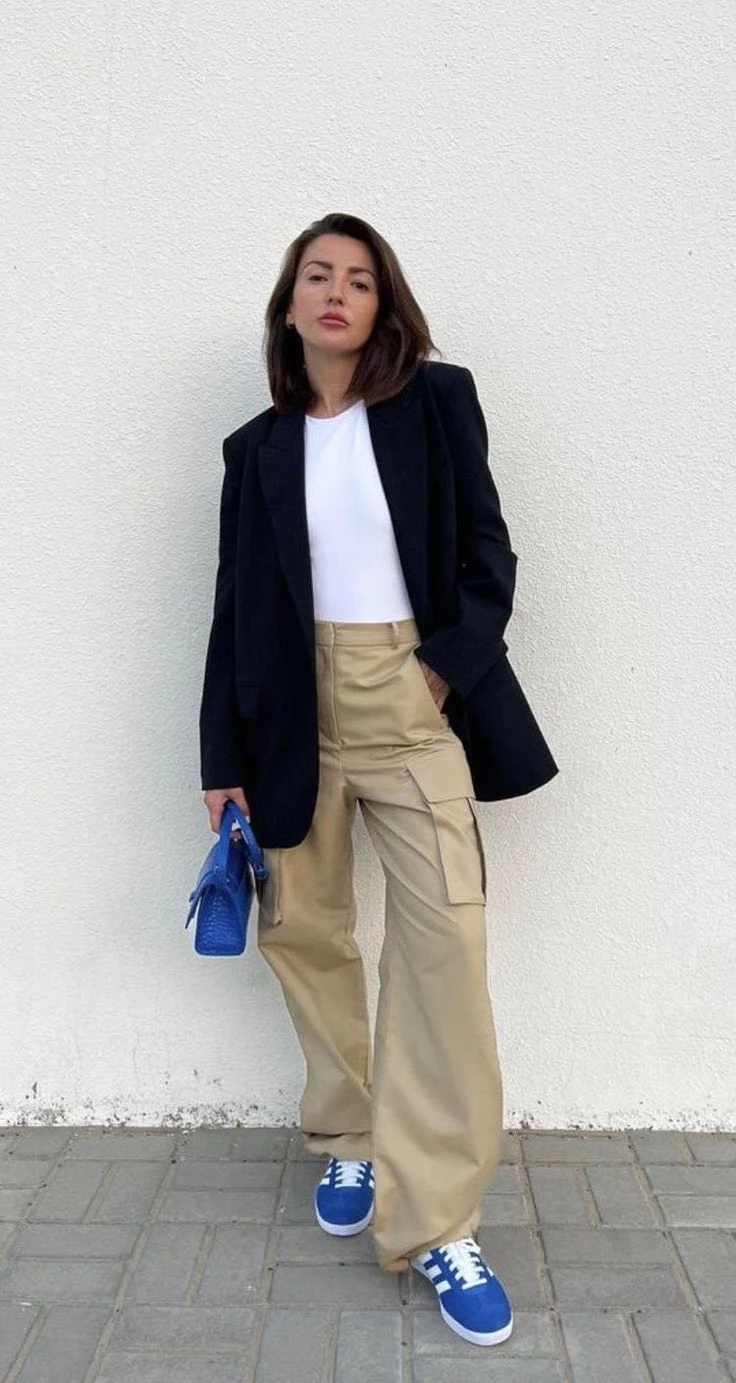 Los cargo son tendencia y muy cómodos. Combinados con un top básico y un blazer, lográs un look descontracturado pero pulido. Ideal para entretiempo. Sumale zapatillas de color para hacer aún más fashionista el look.