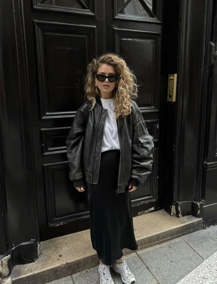 Look 4: pollera midi + zapatillas + campera de cuero