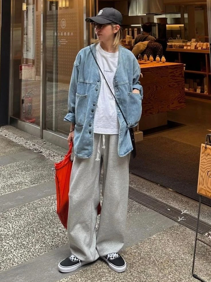 Look 1: pantalón jogger + remera blanca + campera denim oversize