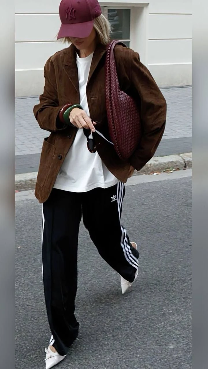 Otra opción más fashionista es llevar el pantalón deportivo con blazer y unos zapatos en punta.