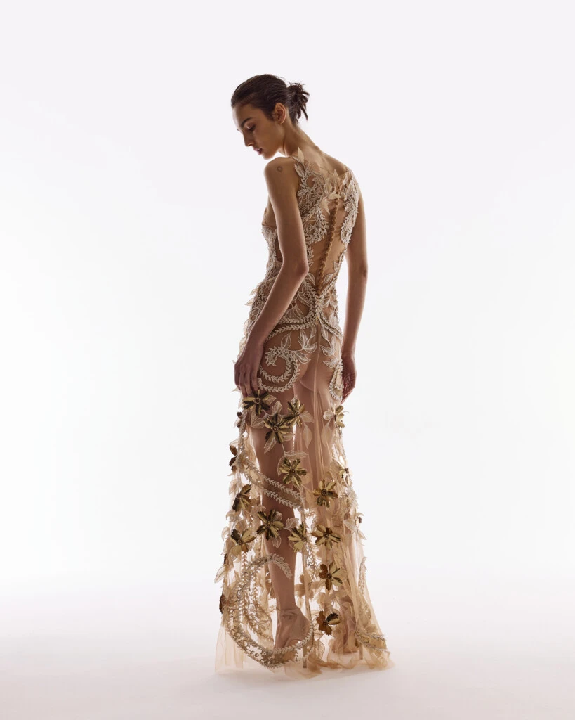 La colección El vuelo inesperado despliega un universo poético y artesanal que une tradición, lujo y contemporaneidad. Cada pieza fue realizada con materiales nobles —hilos de seda natural, organzas, tules y crepes georgette— y bordados con la minuciosidad que distingue al diseñador.