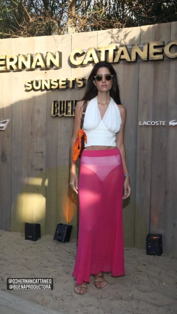 La modelo argentina Azul Gonzalez Aparicio también se sumó a esta tendencia y asistió al sunset que ofreció el DJ Hernán Cattaneo con un look súper sensual. Eligió sumar a su traje de baño blanco con corpiño de escote halter una falda larga de tul en fucsia que insinuaba su silueta. Como complementos sumó unas ojotas de cuero con tiras cruzadas y una mini cartera adornada con un pañuelo de seda.