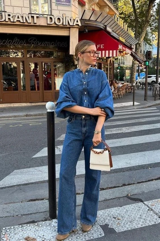 El mix puede ser monocromático, todo en el mismo tono, o jugar con contrastes entre lavados claros y oscuros. También aparecen nuevas versiones con blazers, camisas oversized o jeans más relajados.