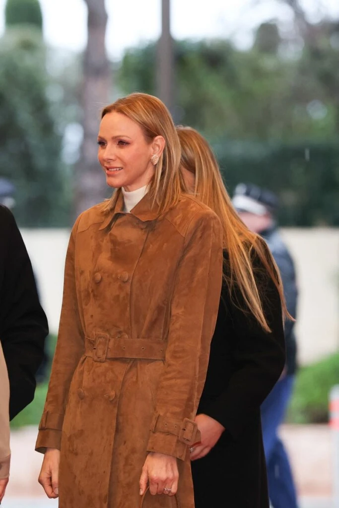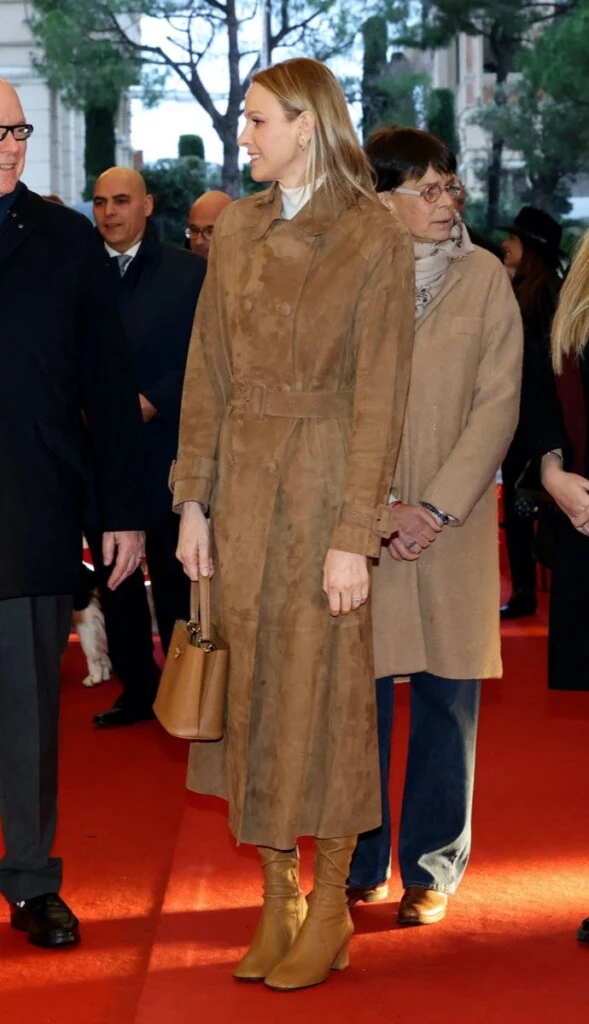 El abrigo, de líneas limpias y silueta clásica, acompañó un estilismo equilibrado y refinado. Charlene lo combinó con botas altas al tono, y una cartera estructurada en cuero de Prada, logrando un look armónico donde la textura fue la verdadera protagonista. La elección del camel reforzó esa idea de elegancia silenciosa, lejos de estridencias, fiel a su estilo minimalista.