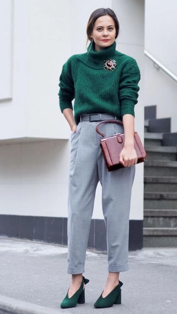 El bordo es un color versátil que se puede combinar con diferentes tonos de grises. Queda muy canchero si lo llevas en un suéter adentro del pantalón y usas accesorios en color off white.