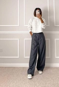 Combinar los pantalones grises con blusas, suéters o blazers blancos es una opción elegante y atemporal que nunca falla. Esta combinación de colores es versátil y se puede usar para crear tanto estilos formales como informales.