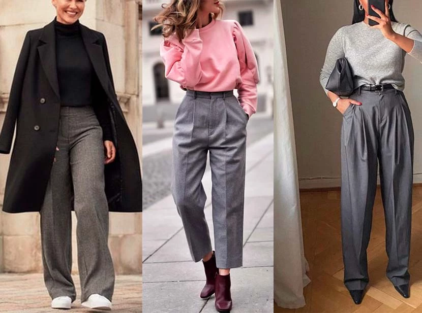 Es la prenda más comodín del guardarropas y cualquiera que sea el diseño que adoptes, ya sea pantalones de vestir, palazzo, leggings, pantalones rectos, pantalones de cintura alta e incluso jeans en tonos grises vas a lograr una silueta muy elegante y chic.