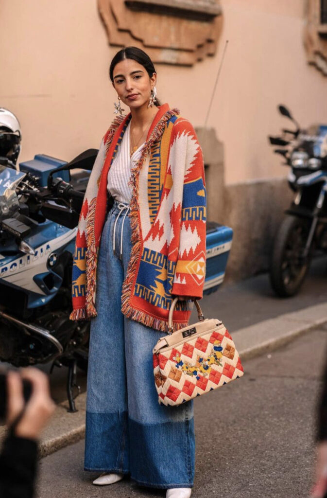 Cárdigan con tejido étnico, camisa cruzada y pantalones wide leg tiro alto. Un look perfecto para implementar esta primavera, que podemos usar durante el día y hasta para ir a trabajar.