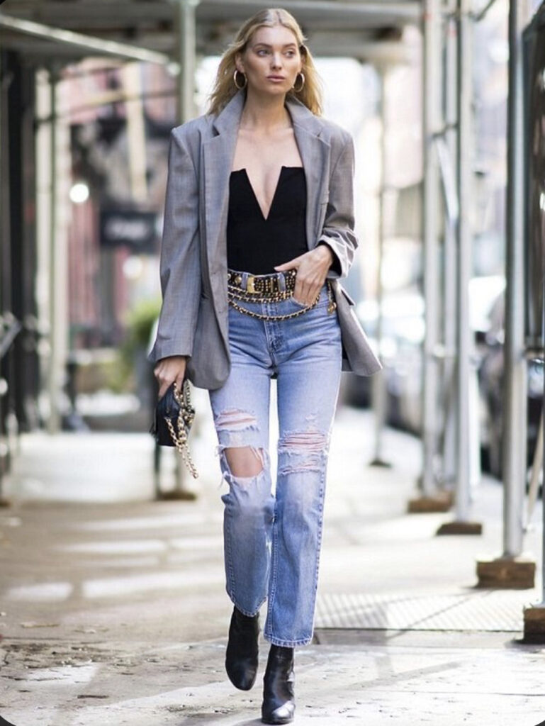 Los jeans con cadenas y dijes como el Chanel que luce la modelo Elsa Hosk son perfectos para combinar con blazer y jeans. Un look clásico y trendy que no podemos dejar de probar.