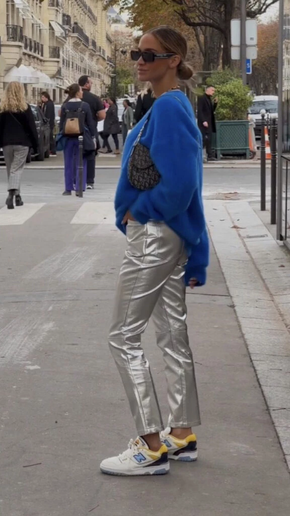 Buzo azul, pantalón plateado, zapatillas y cartera Dior. Un look ultra fashonista con el que podemos ir un viernes a la oficina pero también usar para disfrutar del fin de semana. Sin lugar a dudas la opción más canchera.
