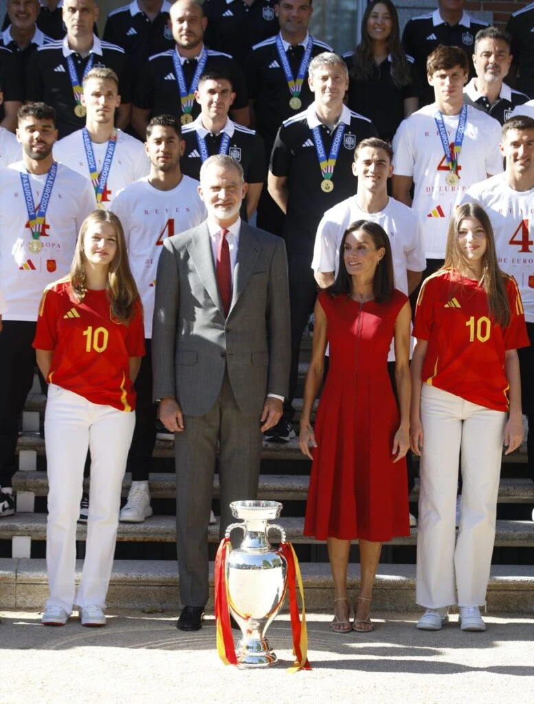 Tras su victoria en Berlín, la Selección España Masculina de fútbol fue recibida por los Reyes de España y para la ocasión la mocarca apostó por un vestido de color rojo. En concreto, la Reina rescató de su guardarropas un moderno vestido de Carolina Herrera en esta vibrante tonalidad que presenta un cierre frontal que recorre toda la prenda. Para darle un toque más fresco lo combinó con unas sandalias de cuero en tono nude que presenta una pulsera al tobillo, tira oblicua en el empeine y un taco de 5 centímetros.