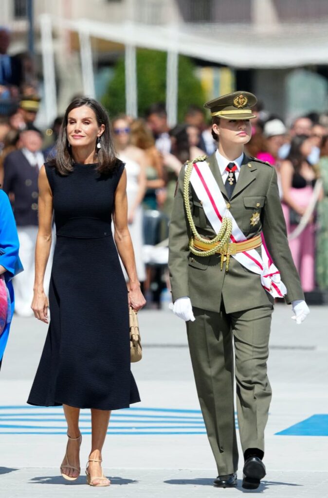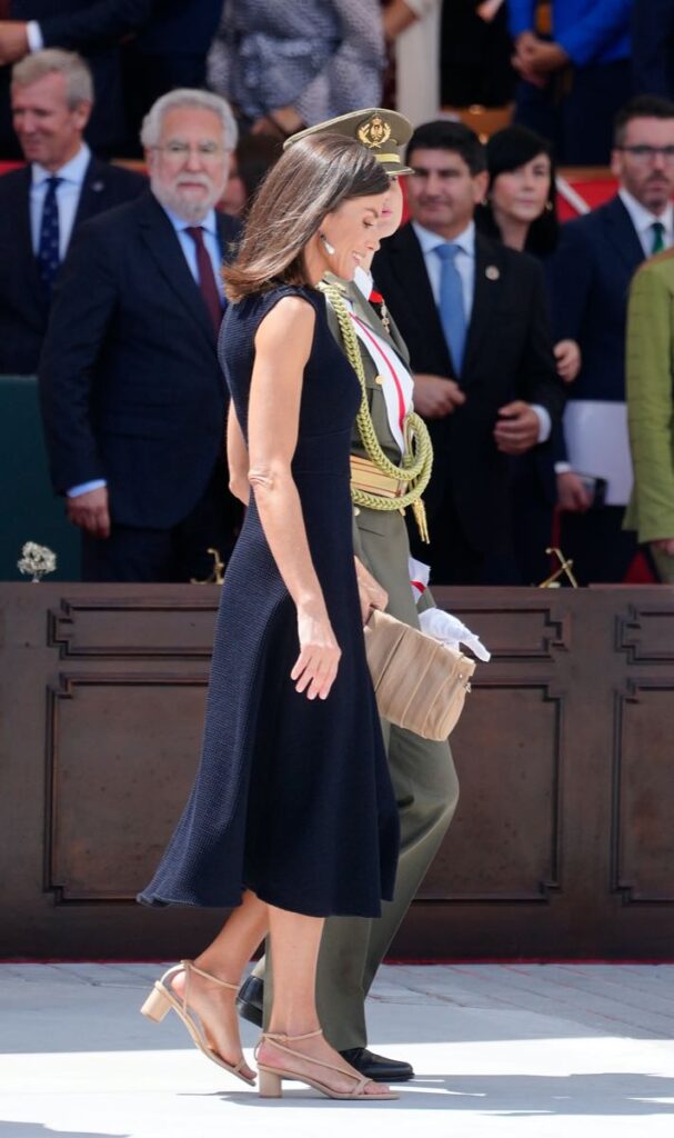 En otra ozasión, la monarca llevó un vestido oscuro, de largo midi, corte evasé y mangas cortas. Un diseño de Carolina Herrera realizado en tejido de punto fino de jacquard.