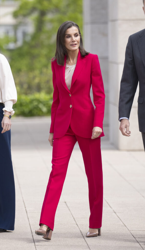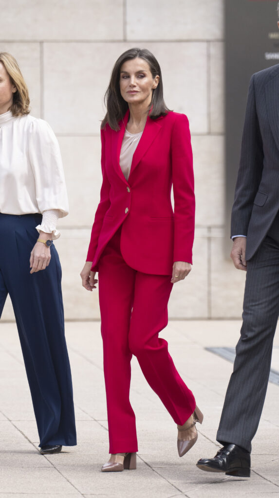 La monarca española llevó un traje en color carmín de Carolina Herrera, de la colección prefall 2019 de Carolina Herrera. De corte clásico, con blazer entallado en la cintura, hombreras y botones y un pantalón sastrero es de talle recto y ligeramente fluido.