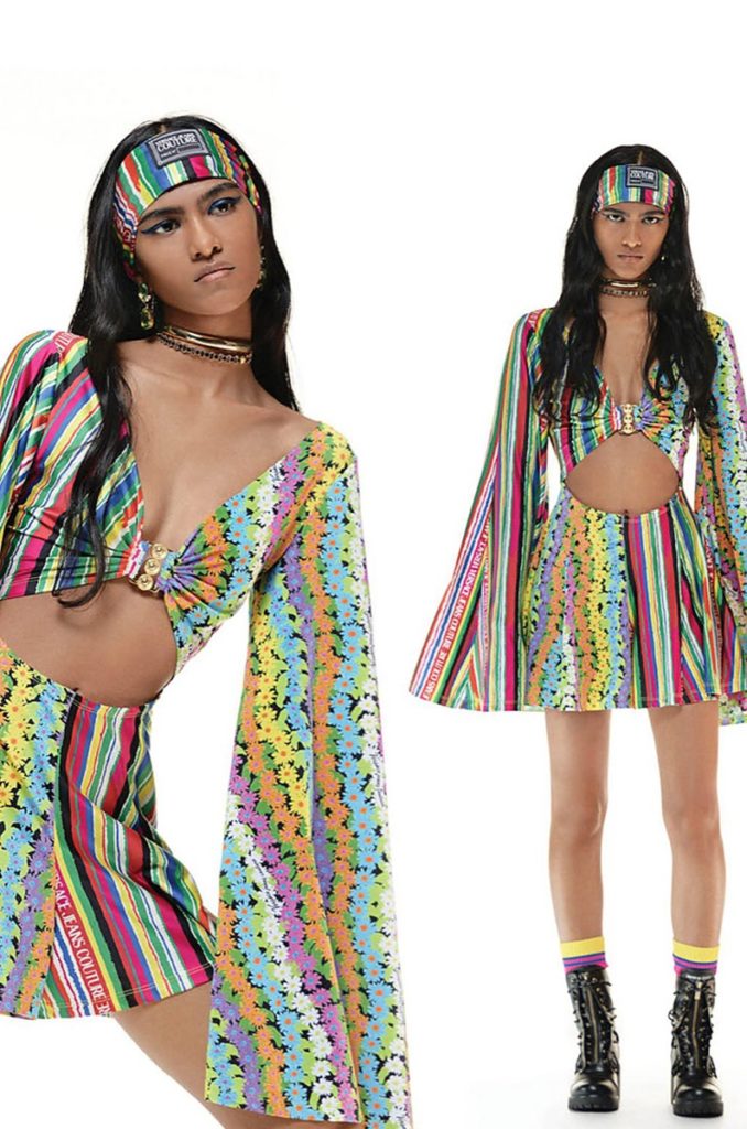 Donatella Versace se inspiró en el movimiento "Rave", término que describe un tipo de baile y fiestas donde predomina la música electrónica, los shows de luces y una duración que en ocasiones se extendía hasta el amanecer.