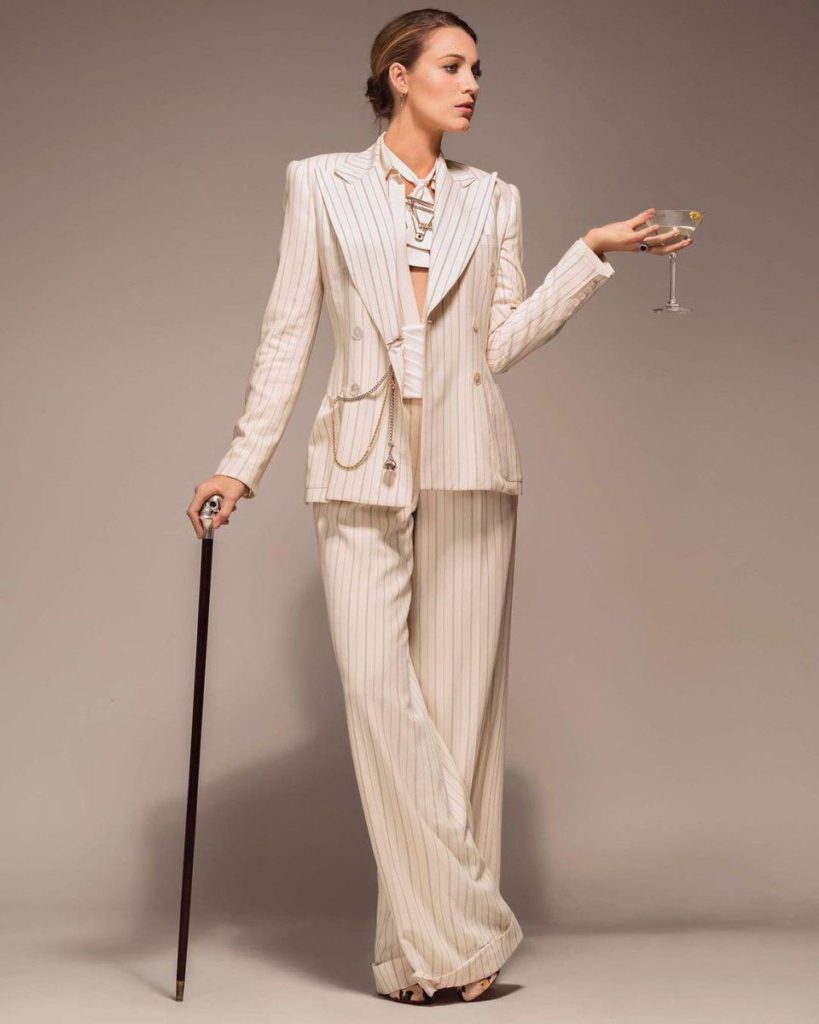 Estilosa, glamourosa, Emily se viste con trajes masculinos en todas sus versiones, diseños de Ralph Lauren: trajes de pantalón, chaqueta y chaleco de raya diplomática en negro, azul marino y en color crema, además de un esmoquin.