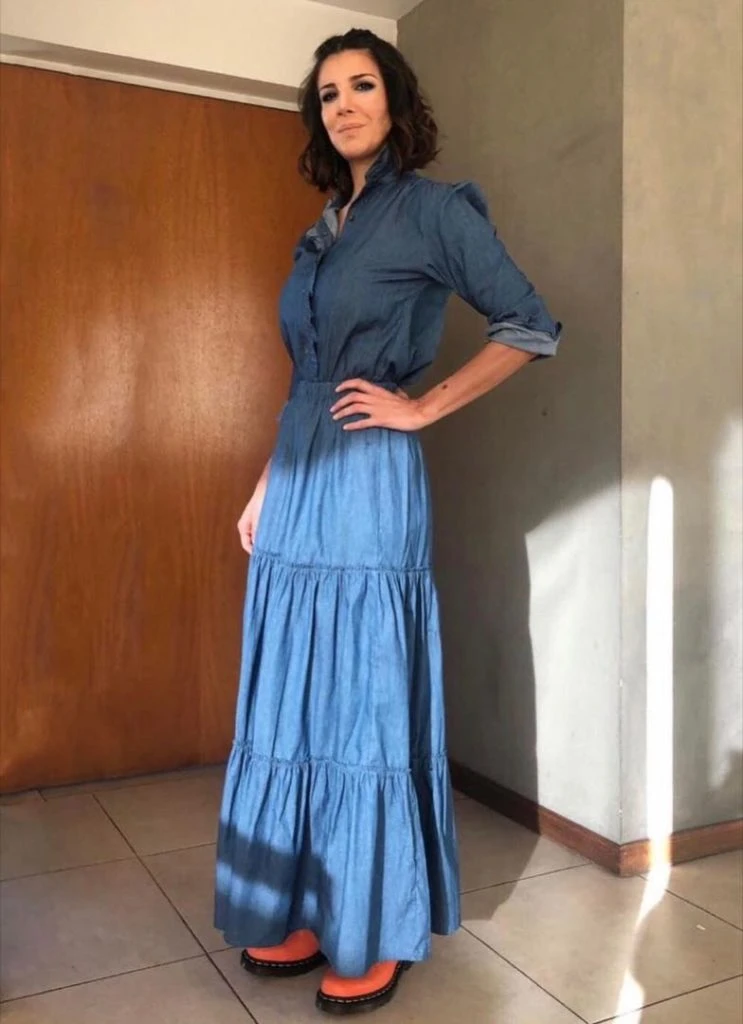 Para la gala de ayer eligió un outfit de total denim: jean con jean. Eligió una blusa con volados y una falda paisana que combinó con borcegos pero también podrían haber sido botas texanas, por ejemplo.