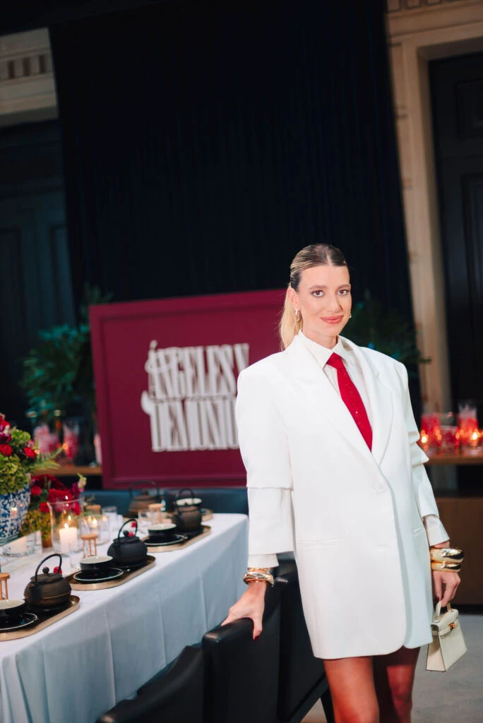 Para este lanzamiento, Angie adoptó un look sastrero súper trendy. En concreto ,llevó un blazer oversize de color off white y lo combinó con una camisa y un short al tono. Para modernizar su outfit, la modelo adoptó una una corbata en color rojo con brillitos que contrasta a la perfección y logra elevar el look a su máxima potencia.